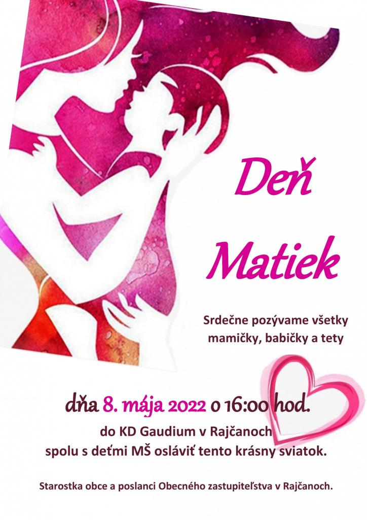 Obecný úrad Rajčany pozýva všetky mamičky, babičky a tety na stretnutie ku dňu matiek dňa 8. mája 2022 o 16:00 hodine do sály KD v Rajčanoch.