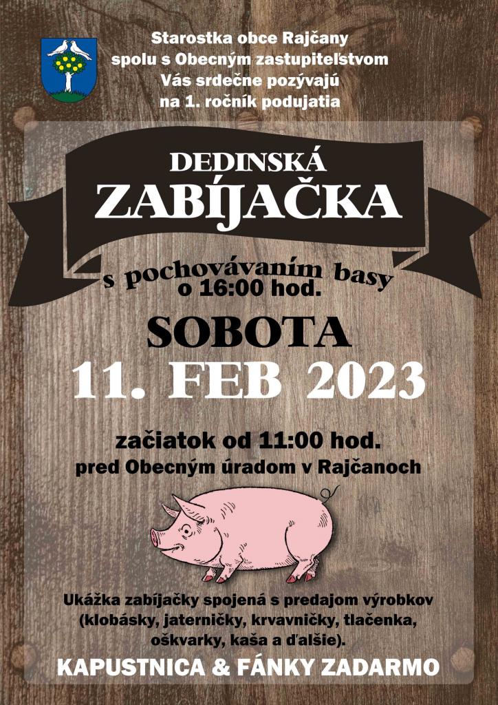Starostka obce Rajčany a poslanci Obecného zastupiteľstva Vás srdečne pozývajú na 1. ročník podujatia DEDINSKÁ ZABÍJAČKA dňa 11.02.2023, t.j. sobota o 11:00 hod. s pochovávaním basy o 16:00 hod. pred Obecným úradom v Rajčanoch.