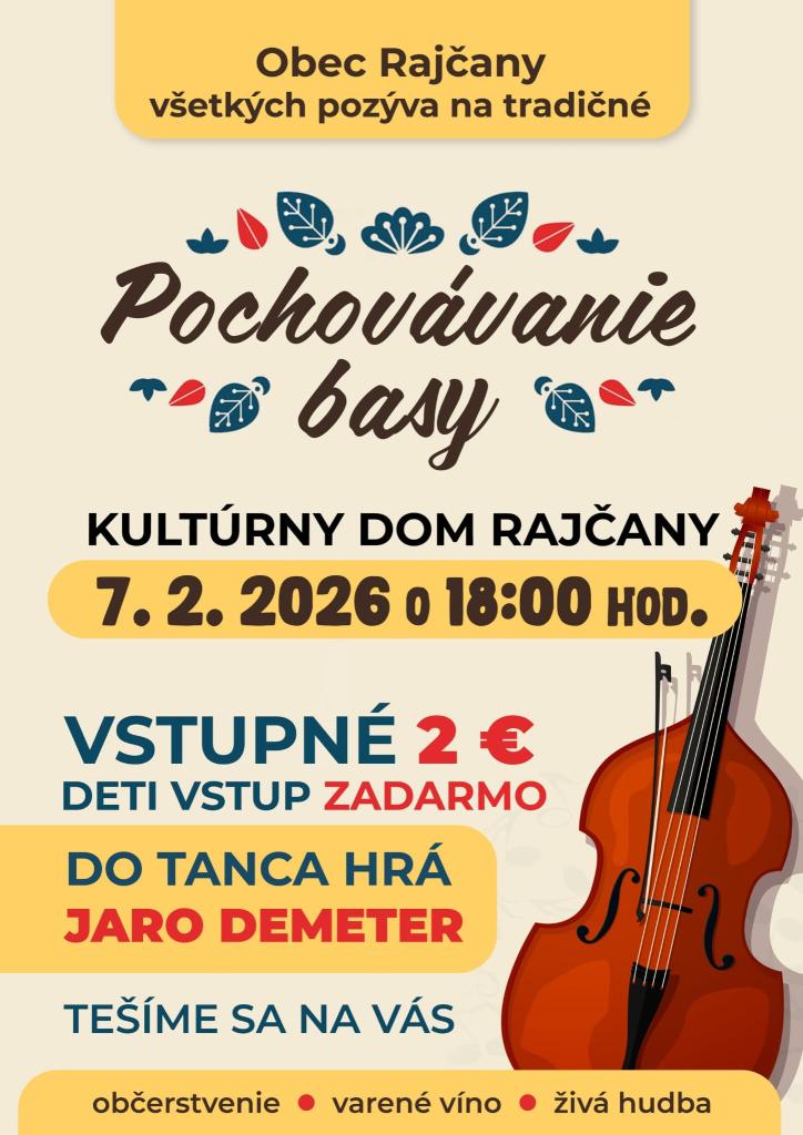 Starostka obce Rajčany a poslanci Obecného zastupiteľstva Vás srdečne pozývajú na POCHOVÁVANIE BASY dňa 7.2.2026, t.j. sobota o 18:00 hod. do Kultúrneho domu Gaudium v Rajčanoch.