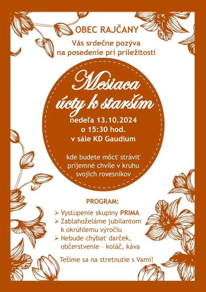 Srdečne pozývame našich spoluobčanov dôchodcov dňa 13. októbra 2024, t.j. v nedeľu o 15:30 hod. do sály KD GAUDIUM Rajčany na posedenie z príležitosti mesiaca úcty k starším spojené s kultúrnym programom a občerstvením.